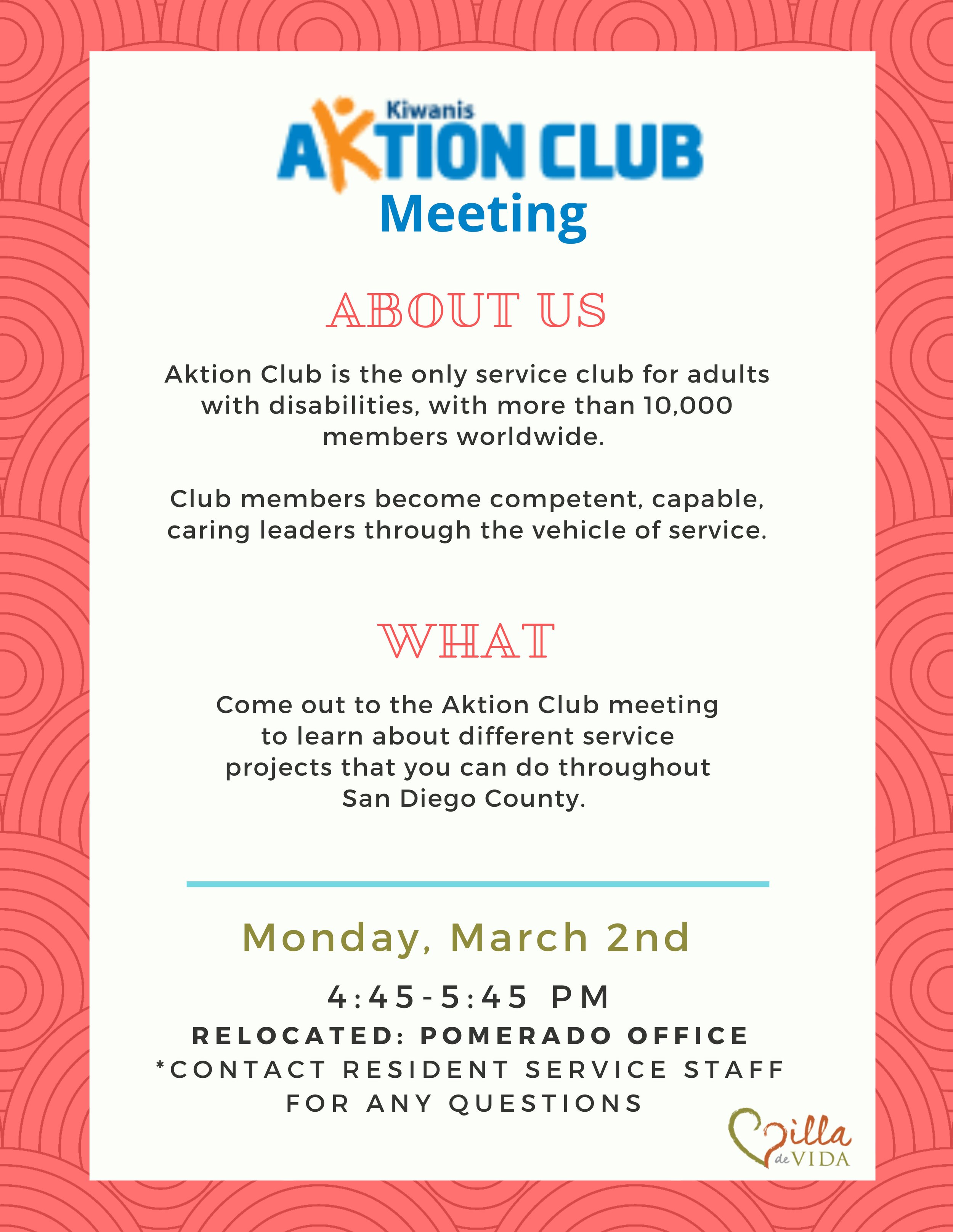Back to All Events Aktion Club Monday, March 2, 2026 4:45 PM 5:45 PM Villa de Vida, Inc. 12939 Pomerado Road Poway, CA, 92064 United States (map) Google Calendar ICS