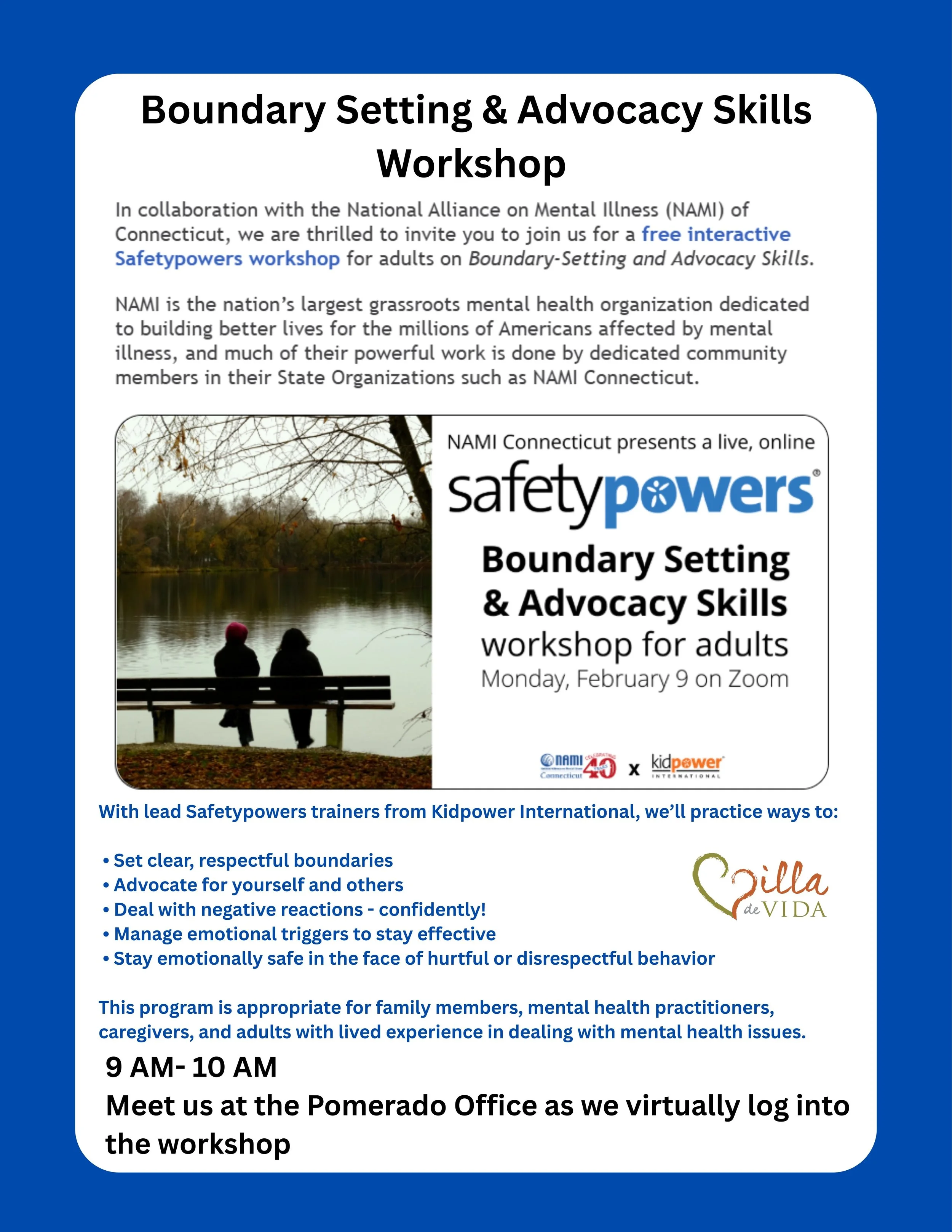 National Alliance on Mental Illness (NAMI) of Connecticut & Safetypowers workshop for adults on Boundary-Setting and Advocacy Skills. Monday, February 9, 2026 9:00 AM 10:00 AM Villa de Vida, Inc. 12939 Pomerado Road Poway, CA, 92064 United States (map) Google Calendar ICS