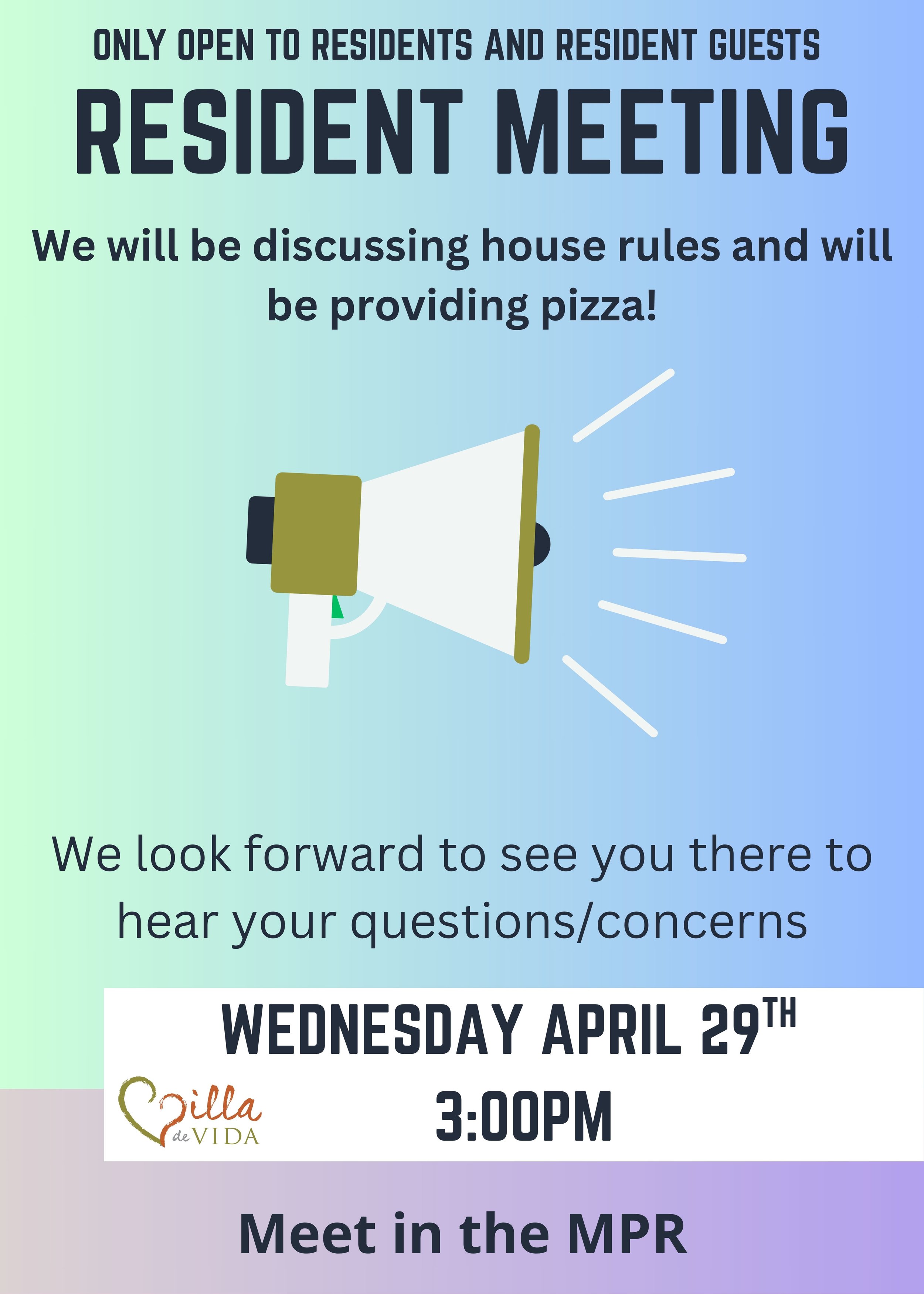 Resident Meeting Wednesday, April 29, 2026 3:00 PM 4:00 PM Villa de Vida, Inc. 12341 Oak Knoll Road Poway, CA, 92064 United States (map) Google Calendar ICS