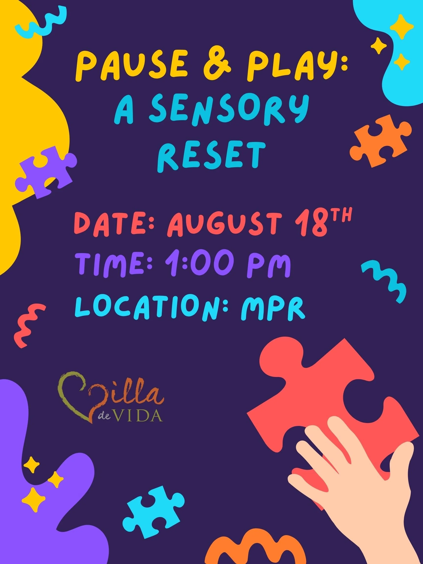 Pause & Play: A Sensory Reset Monday, August 18, 2025 1:00 PM 2:00 PM Villa de Vida, Inc. 12341 Oak Knoll Road Poway, CA 92064 USA (map) Google Calendar ICS