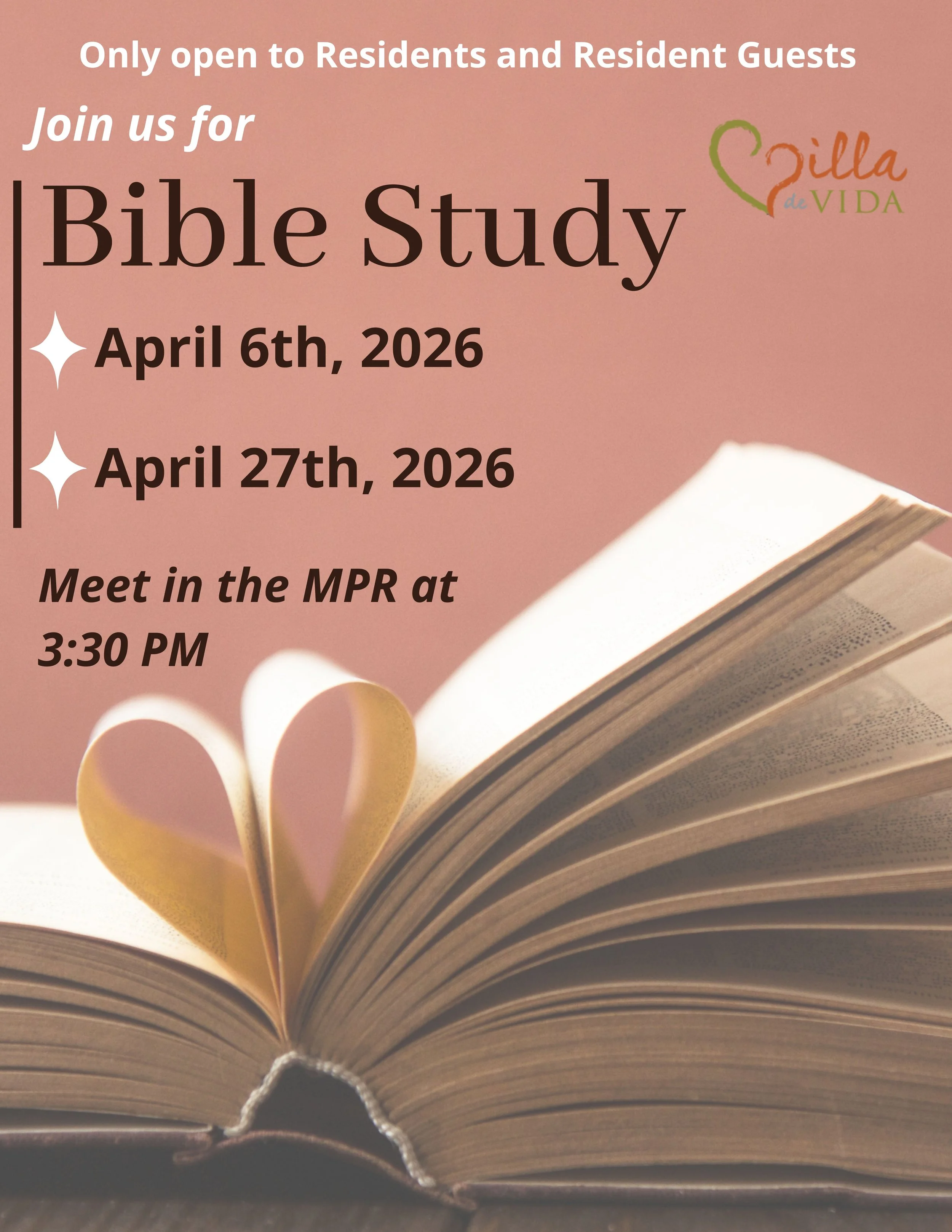 Bible Study Monday, April 6, 2026 3:30 PM 4:30 PM Villa de Vida, Inc. 12341 Oak Knoll Road Poway, CA, 92064 United States (map) Google Calendar ICS