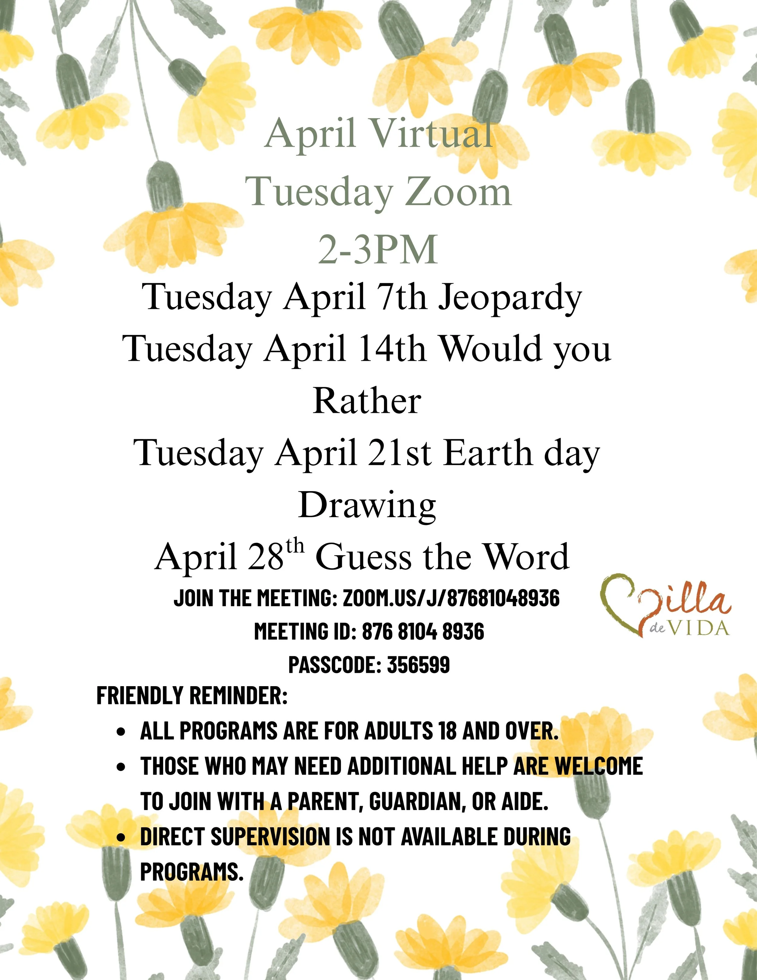 Back to All Events Virtual Tuesday Tuesday, April 28, 2026 2:00 PM 3:00 PM Villa de Vida, Poway 12341 Oak Knoll Road Poway, CA, 92064 United States (map) Google Calendar ICS