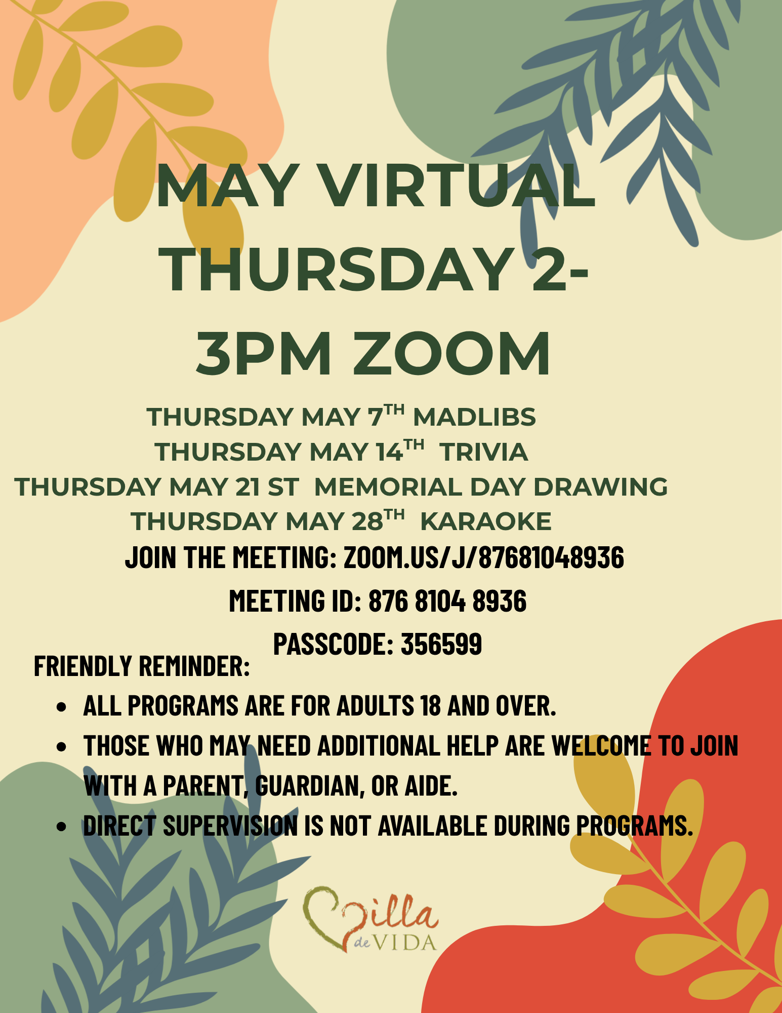 Virtual Thursday May Thursday, May 21, 2026 2:00 PM 3:00 PM Villa de Vida, Inc. 12939 Pomerado Road Poway, CA, 92064 United States (map) Google Calendar ICS